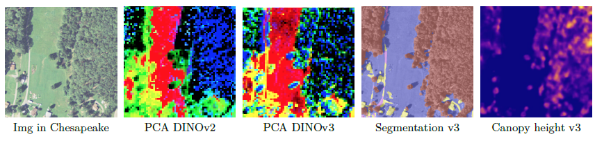 그림 18: 단일 DINOv3 모델로 가능해진 원격탐사 응용 예시. DINOv3 특징 기반 PCA는 DINOv2보다 더 정밀한 세부 정보를 보여준다. 분할 맵은 GEO-Bench Chesapeake 라벨만으로 계산되었다. 수관 높이 모델 디코더는 Open-Canopy 데이터셋(4채널: RGB+IR)에서 학습했으나, 추론은 RGB 채널만으로 수행했다.