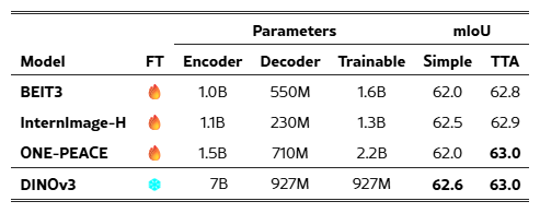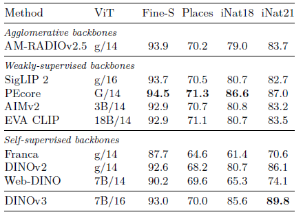 - DINOv3 위성 및 웹 모델(백본 고정, frozen)은 15개 분류·분할·수평 객체 탐지 과제 중 12개에서 새로운 SOTA를 달성했다.
