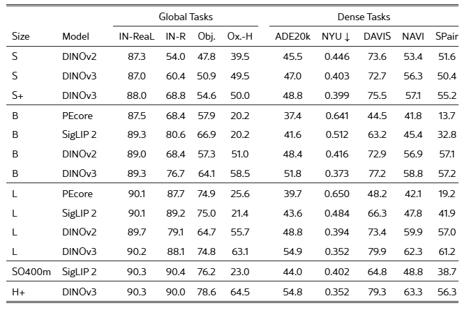 전반적으로 DINOv3 패밀리는 광범위한 벤치마크에서 강력한 성능을 보이며, 전역(global) 과제에서는 경쟁 모델들과 비슷하거나 더 나은 정확도를 달성하고, 밀집 예측 과제(dense prediction tasks)에서는 이들을 압도적으로 능가한다(Fig. 2 참조).