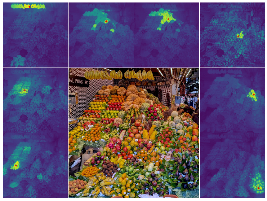 4096×4096 고해상도 입력 이미지에서, 빨간 십자가로 표시된 패치와 모든 다른 패치 간 코사인 유사도 맵을 시각화한 결과. DINOv3 출력 특성으로 얻은 결과는 매우 정교한 공간적 구조를 보여준다.