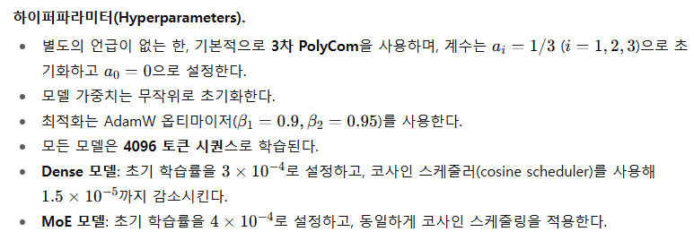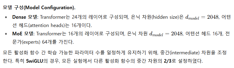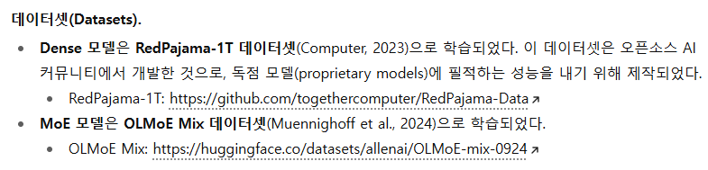 - MoE 모델은 OLMoE 프레임워크(Muennighoff et al., 2024)를 사용하며, 총 69억(6.9B)개의 파라미터 중 13억(1.3B)개 파라미터만 활성화된다.