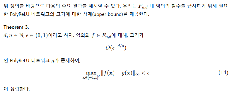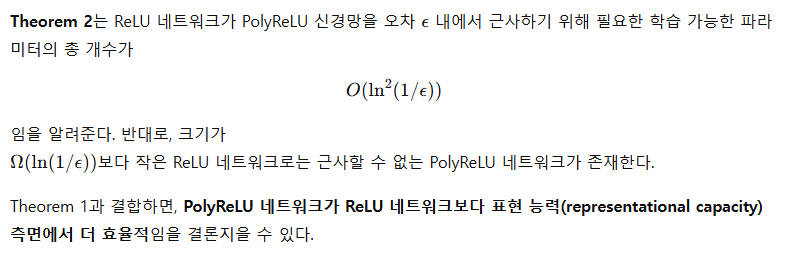 - 이론적으로, PolyReLU 네트워크가 ReLU 네트워크를 근사(approximate)하는 데 필요한 학습 가능한 파라미터 개수에 대한 경계를 유도하고, 그 반대 경우도 제시한다. 추가로, 크기가 O(ϵ^(-d/n))인 PolyReLU 네트워크가 Sobolev 공간(Sobolev spaces) 내 임의의 함수를 오차 허용치 ϵ 내에서 근사할 수 있으며, 이때 최적 근사율(optimal approximation rates)을 달성함을 보인다.