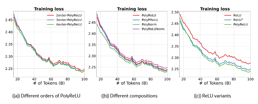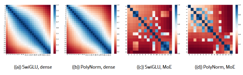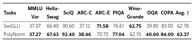 - 실험적으로는, 10억(1B) 파라미터 규모의 밀집(dense) 모델과 10억 활성(1B active)·70억 총합(7B total) 파라미터 규모의 MoE(Mixture of Experts) 모델을 대상으로 새로운 활성화 함수의 효과성을 검증하였다. 두 모델 모두에서 PolyCom은 수렴 속도를 가속화할 뿐 아니라, SwiGLU, GELU, ReLU 등의 기존 활성화 함수들을 현저히 능가하는 성능을 보였다.