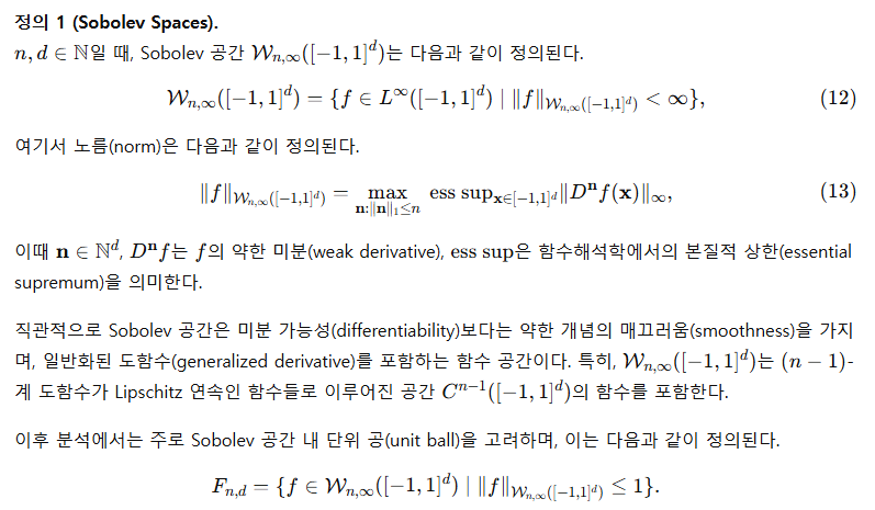 Yarotsky (2017), Boullé et al. (2020)와 유사하게, 본 절에서는 Sobolev 공간(Adams & Fournier, 2003)의 맥락에서 PolyReLU 네트워크의 보편 근사 능력(universal approximation capabilities)을 탐구한다. 구체적으로, 우리는 PolyReLU 네트워크가 이 공간에서 최적 근사율(optimal approximation rate)을 달성함을 보인다. 이는 곧 PolyReLU 네트워크가 Sobolev 공간에서 일반적인 매끄러운 함수(smooth functions)를 근사하기 위해 다른 활성화 함수를 사용하는 네트워크보다 더 적은 파라미터만 필요하다는 것을 의미한다.