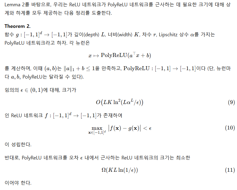 이 절에서는 PolyReLU 네트워크를 ReLU 네트워크로 근사하는 데 관한 이론적 결과를 제시한다. 다음의 Lemma 2는 PolyReLU 활성화 함수가 주어진 오차 허용 범위(error tolerance) 내에서 ReLU 네트워크로 근사될 수 있음을 보여준다.