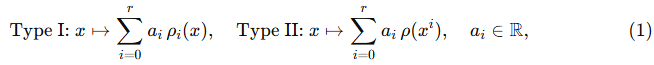 두 방식의 핵심적인 차이는 함수를 거친 뒤 거듭제곱(power)을 적용하는지, 아니면 거듭제곱을 적용한 뒤 함수를 적용하는지에 있다. 그러나 ρ가 비선형 함수일 경우, 이론적으로 두 방식은 동등한 표현력을 가진다. 이는 다항식 항이 조합(composition)에 대해 대칭적이므로 Type I과 Type II 모두 유사한 함수 계열을 근사할 수 있기 때문이다. 즉, ρ와 다항식 거듭제곱의 순서를 바꾸어도 복잡한 비선형 함수를 근사하는 능력은 변하지 않는다.
