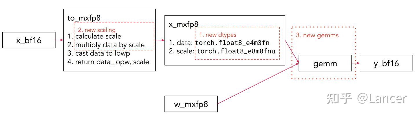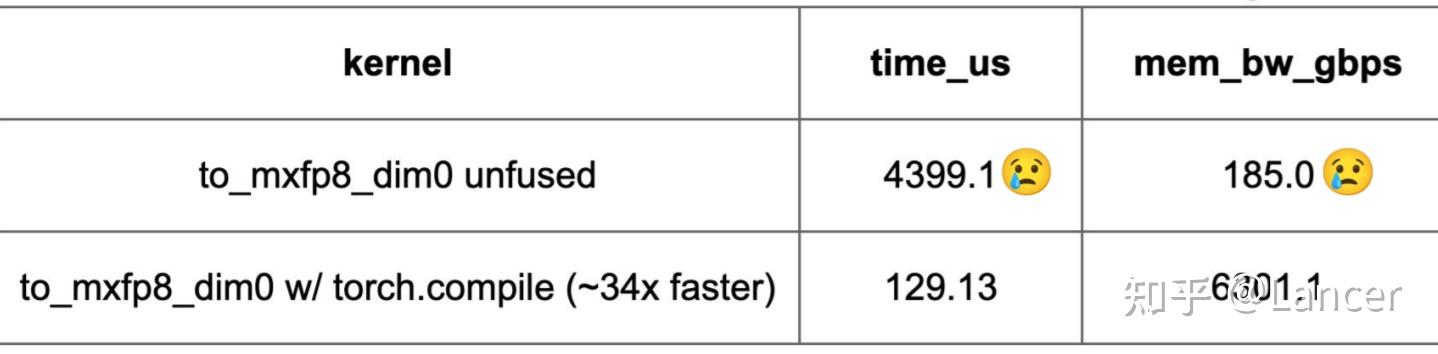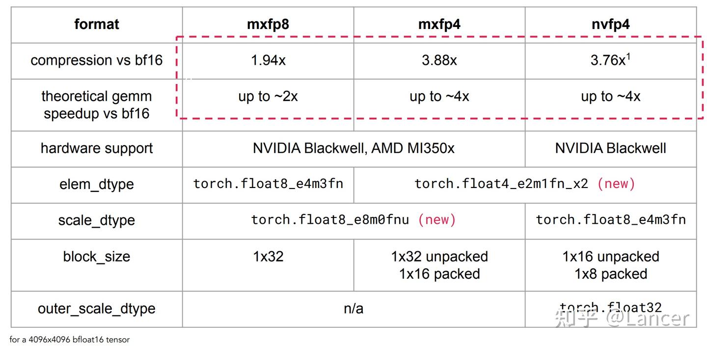 4096×4096 크기의 BF16 텐서를 기준으로 할 때, mxfp8, mxfp4, nvfp4가 PyTorch에서 사용하는 핵심 기술 파라미터는 다음 표와 같다.