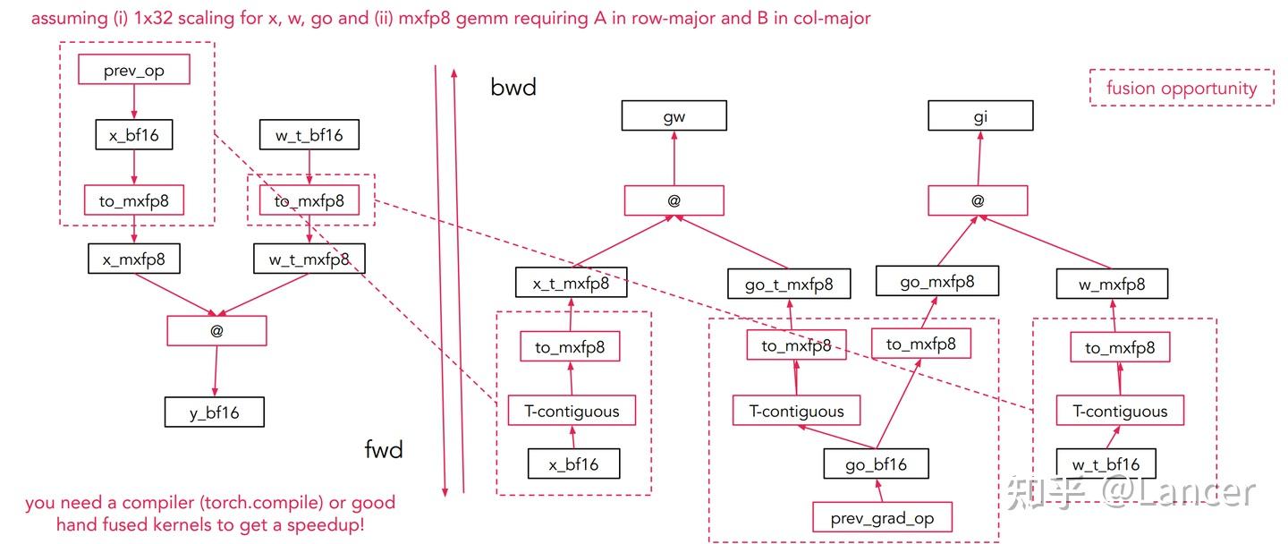 mxfp8 기반의 행렬곱(mm) 연산에서 순전파(forward) 와 역전파(backward) 를 수행하는 경우를 보면 다음과 같다.