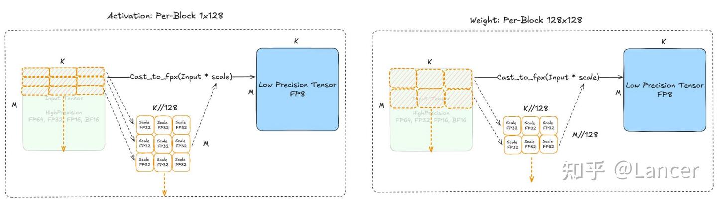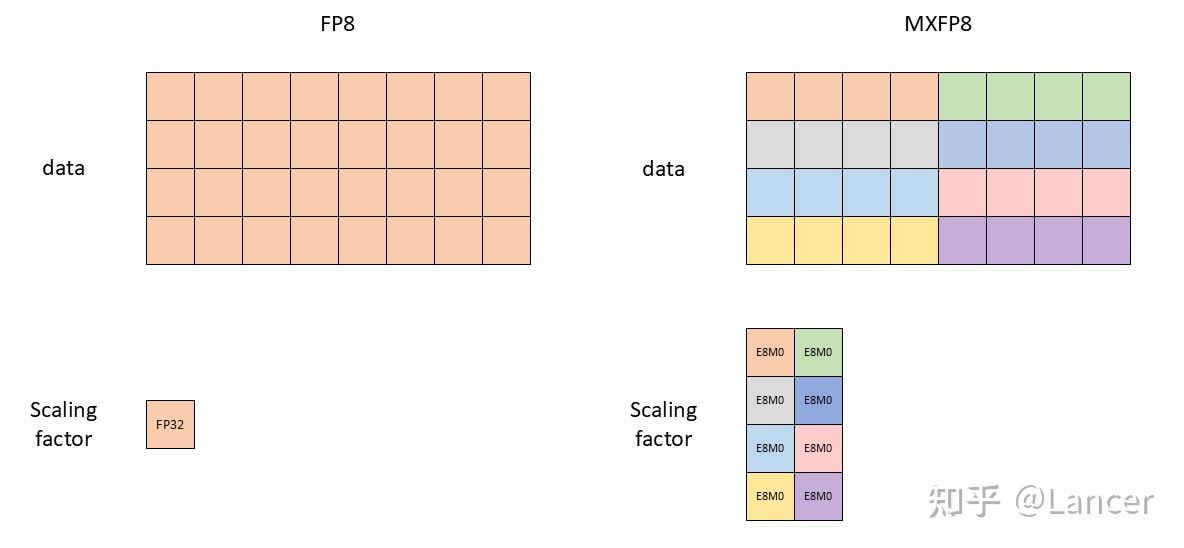 - 표준 FP8(E4M3, E5M2 등): 부동소수점 구조이지만 전체 텐서에 단일 scale(per-tensor scaling)을 적용하기 때문에, 동일 블록 안의 큰 값과 작은 값을 동시에 잘 표현하기 어렵다. 이로 인해 양자화 오차가 커진다.