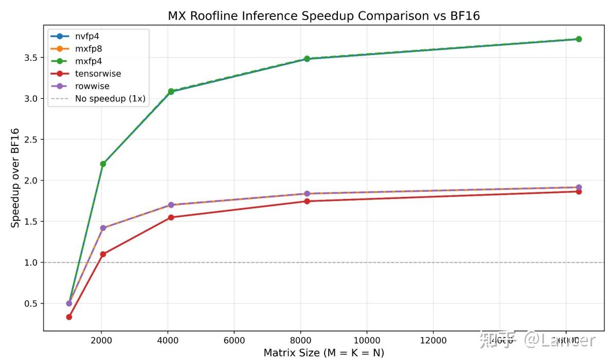 행렬 크기가 커질수록 mxfp8, mxfp4, nvfp4의 가속 비율은 더욱 높아지며,