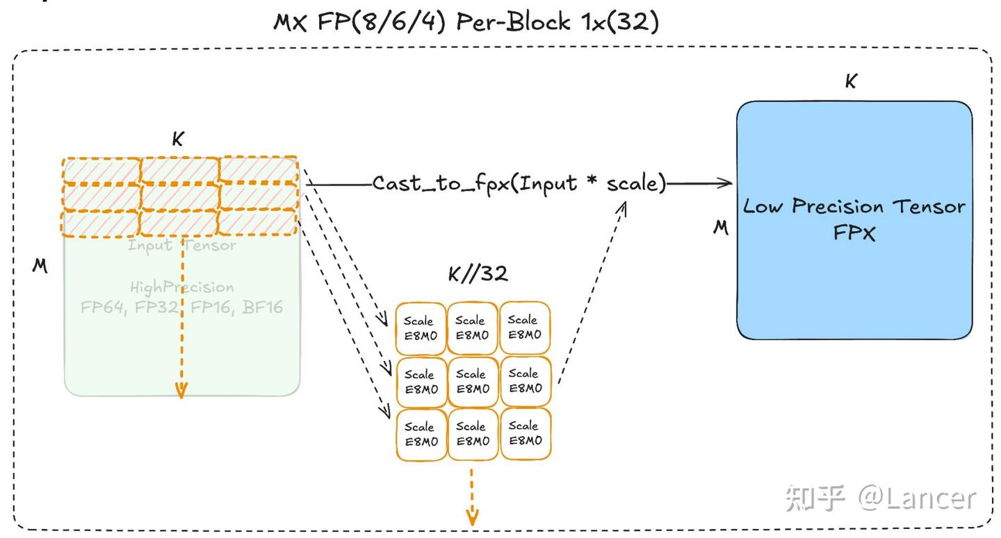 mxfp8, mxfp4, nvfp4는 모두 유사한 원리로 구성되며, 여기서는 mxfp8 기반 GEMM(일반 행렬 곱셈) 구성을 예시로 설명한다.
