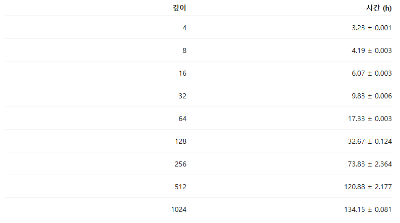 표 3: 10개 모든 환경에서 깊이 4, 8, 16, 32, 64에 대한 실제 경과 시간(단위: 시간)