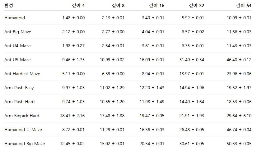 표 4: Humanoid U-Maze 환경에서 깊이 4부터 1024까지 학습했을 때의 총 실제 경과 시간(단위: 시간)