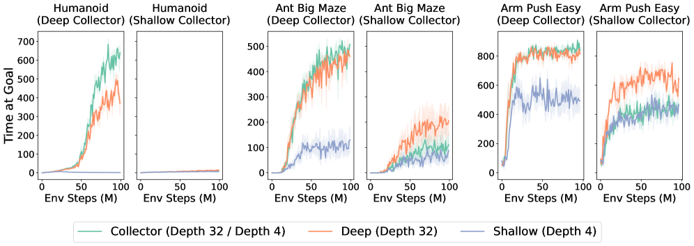다음으로, 기준선 알고리즘들에서 네트워크 깊이를 증가시켰을 때 CRL에서 관찰된 것과 유사한 성능 향상이 나타나는지 분석한다. 그 결과, SAC, SAC+HER, TD3+HER는 깊이를 4층을 초과해 늘려도 성능 향상을 거의 얻지 못했으며, 이는 기존 연구 결과와도 일치한다(Lee et al., 2024; Nauman et al., 2024b). 또한 GCSL과 GCBC는 Humanoid 및 Ant Big Maze 태스크에서 유의미한 성능을 전혀 달성하지 못했다. 흥미롭게도 한 가지 예외가 관찰되었는데, Arm Push Easy 환경에서는 GCBC가 네트워크 깊이를 늘렸을 때 성능 향상을 보였다.