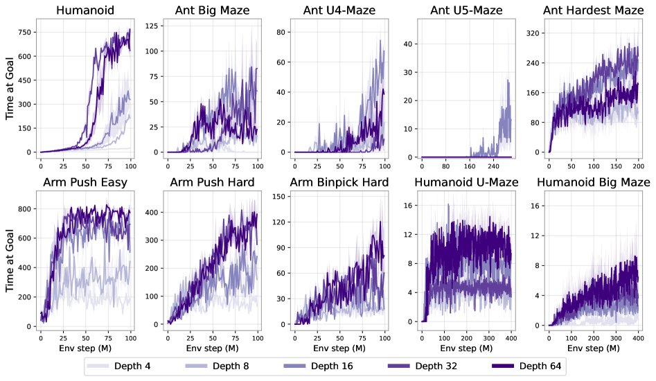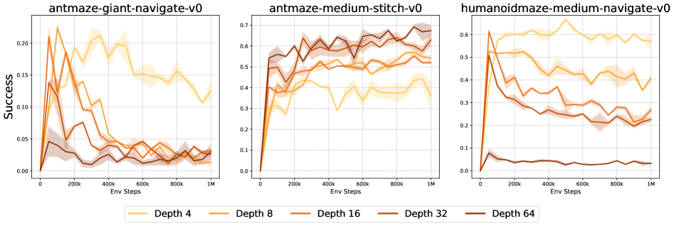 네트워크 깊이를 확장하면 다양한 보행, 내비게이션, 조작 태스크 전반에서 성능 향상이 나타난다. Ant Big Maze에서는 깊이 8층, Humanoid U-Maze에서는 깊이 64층과 같이 특정 임계 깊이를 지날 때 성능이 완만하게 증가하는 것이 아니라 급격히 도약하는 양상을 보이는데, 이는 질적으로 구별되는 정책이 그 깊이에서 새롭게 나타나기 때문이다(섹션 4 참고). 성능 향상 폭은 2배에서 Humanoid 기반 태스크에서는 최대 50배까지 도달한다.