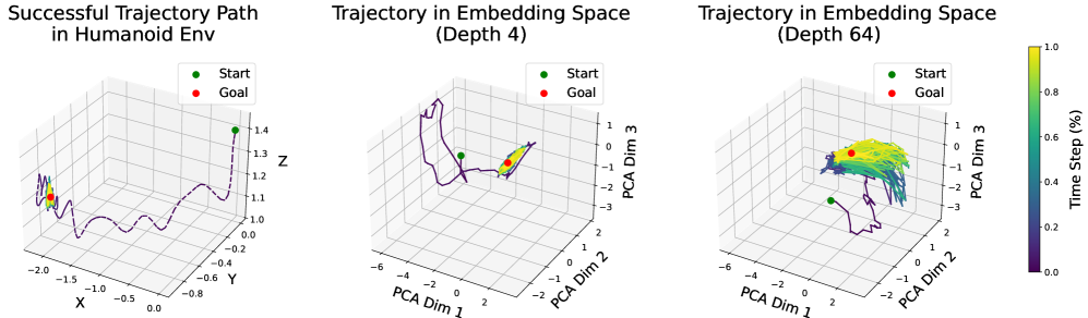 그림 10: Humanoid 태스크에서 성공적인 궤적을 따라, 얕은 네트워크(깊이 4)와 깊은 네트워크(깊이 64)의 상태–행동 임베딩을 시각화한다. 목표 근처에서 깊은 네트워크의 임베딩은 곡면을 따라 넓게 확장되는 반면, 얕은 네트워크의 임베딩은 좁은 군집을 형성한다. 이는 깊은 네트워크가 상태 공간 중 더 자주 방문되고 태스크 성공에 중요한 영역에 더 많은 표현 용량을 할당하고 있을 가능성을 시사한다.