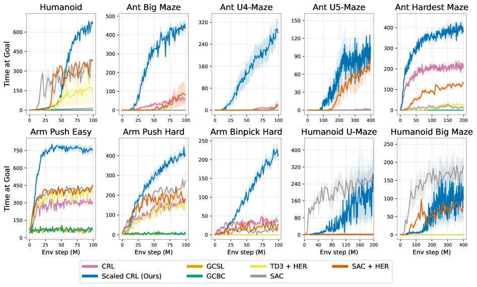 그림 19: 본 논문의 스케일링 결과는 JaxGCRL 벤치마크에서 검증되었으며, 보행(locomotion), 내비게이션(navigation), 조작(manipulation) 등 다양한 태스크 전반에 걸쳐 일관되게 재현됨을 보여준다. 이 태스크들은 보조 보상(auxiliary reward)이나 시연(demonstrations)이 전혀 제공되지 않는 온라인 목표 조건 강화학습 설정으로 구성되어 있다. 그림은 (Bortkiewicz et al., 2024)에서 인용하였다.