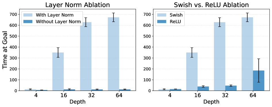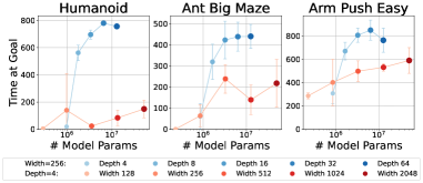 실험은 시연(demonstrations)이나 보상(rewards)이 전혀 주어지지 않는 비지도 목표 조건(unsupervised goal-conditioned) 설정에서 진행되며, 이 환경에서 에이전트는 완전히 처음부터 탐색을 수행하고 주어진 목표에 도달할 확률을 최대화하는 방법을 학습해야 한다. 시뮬레이션 기반 보행 및 조작(manipulation) 태스크에서 평가한 결과, 제안 방식은 자기지도 대비학습 기반 RL(contrastive RL) 알고리즘의 성능을 2배에서 최대 50배까지 향상시키며, 다른 목표 조건 기반 기법들을 능가했다. 모델 깊이를 증가시키는 것은 단순히 성공률을 높이는 데 그치지 않고, 에이전트가 학습하는 행동 양상 자체를 질적으로 변화시키는 것으로 나타났다. 프로젝트 웹페이지와 코드는 다음 링크에서 확인할 수 있다: https://wang-kevin3290.github.io/scaling-crl/.