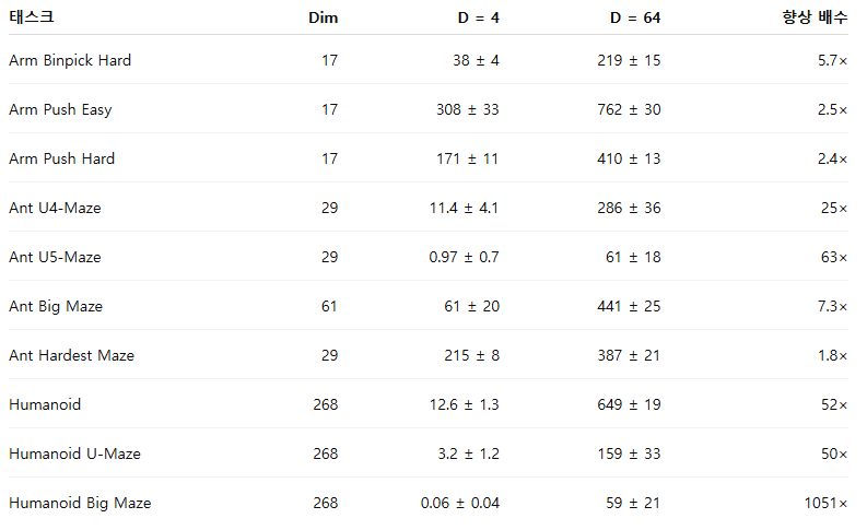 표 1: 네트워크 깊이를 증가시키면(깊이 D = 4 → 64) CRL의 성능이 향상된다(그림 1 참조). 깊이 확장의 효과는 관측 차원(Dim)이 클수록 더욱 크게 나타난다.