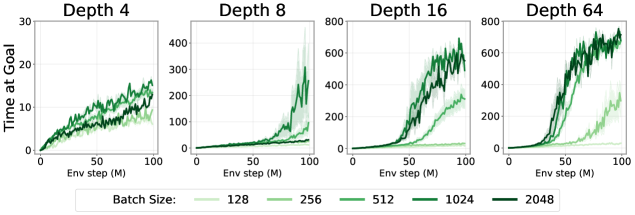 그림 12: 스케일링의 한계 테스트. 그림 1의 결과를 확장하여, 난이도가 높은 Humanoid 미로 환경에서 네트워크 규모를 더욱 키운 실험 결과를 제시한다. Humanoid U-Maze 환경에서 네트워크 깊이가 256층과 1024층에 이르러도 성능 향상이 지속됨을 확인했다. 단, 1024층 네트워크의 경우 학습 초기에 액터 손실(actor loss)이 발산하는 현상이 관찰되었기 때문에, 액터 네트워크의 깊이는 512로 유지하고 두 개의 크리틱 인코더에만 1024층 네트워크를 적용했다.