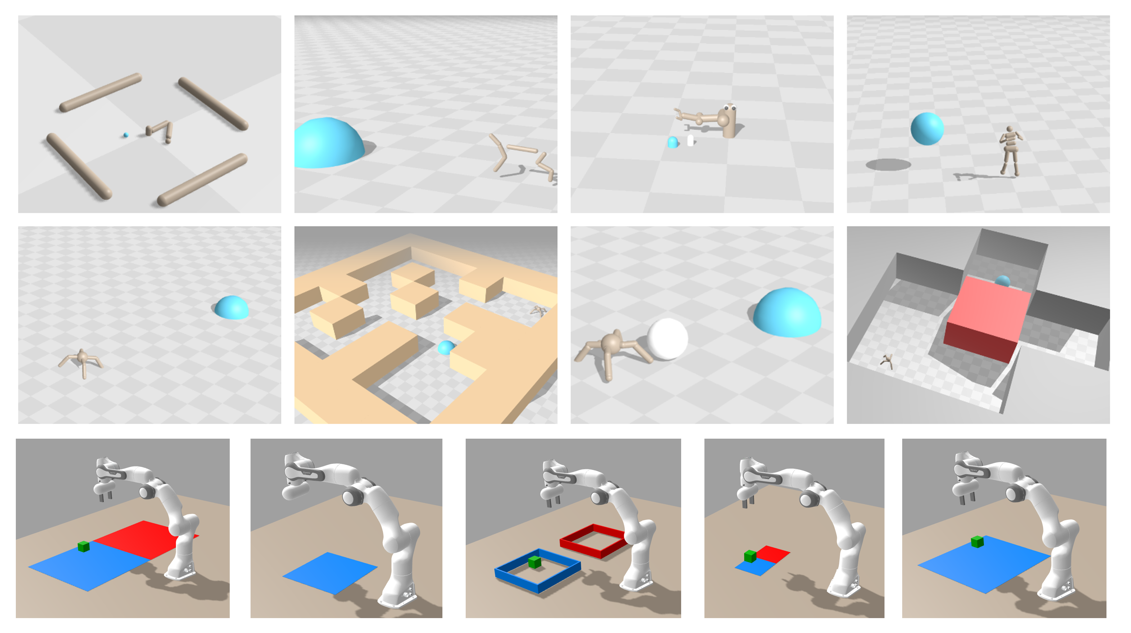 본 연구의 실험은 그림 19에 시각화된 JaxGCRL의 GPU 가속 환경 세트를 사용하며, 대비학습 기반 강화학습(contrastive RL) 알고리즘과 그에 대응하는 하이퍼파라미터는 표 7에 제시되어 있다. 구체적으로, 다음의 10개 환경을 사용하였다.