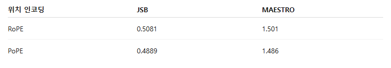 표 2: 음악 데이터셋(JSB, MAESTRO)에서 RoPE 또는 PoPE 위치 인코딩을 사용한 Transformer 모델의 테스트 분할 기준 최적 음의 로그우도(NLL)