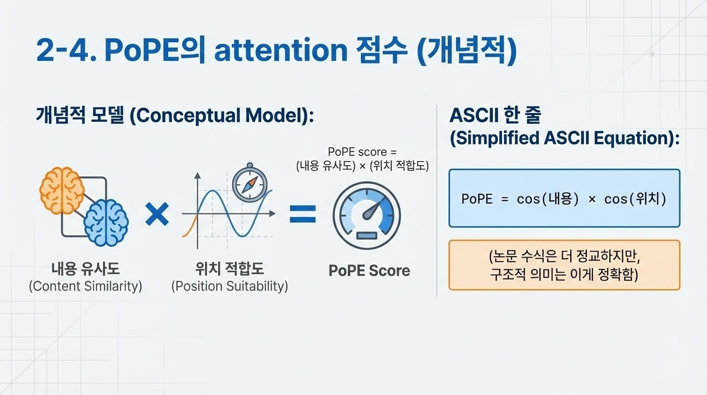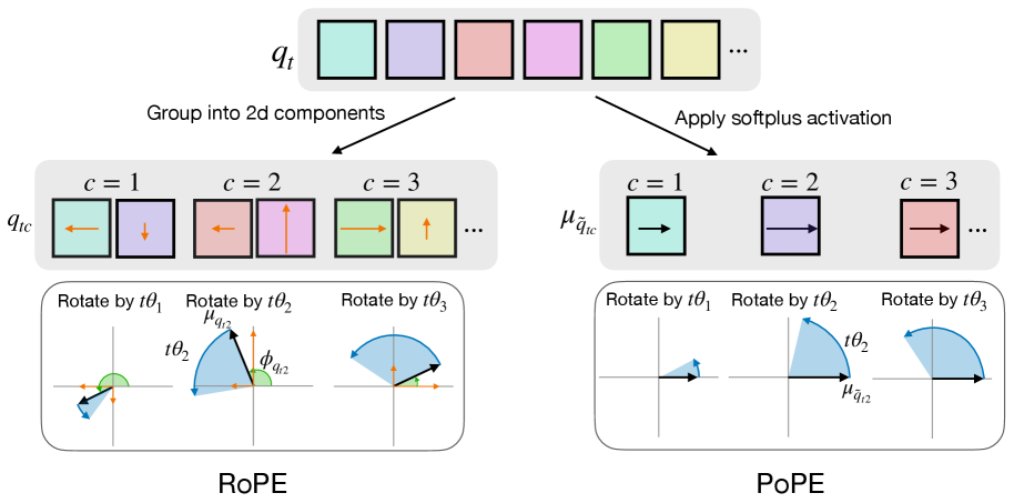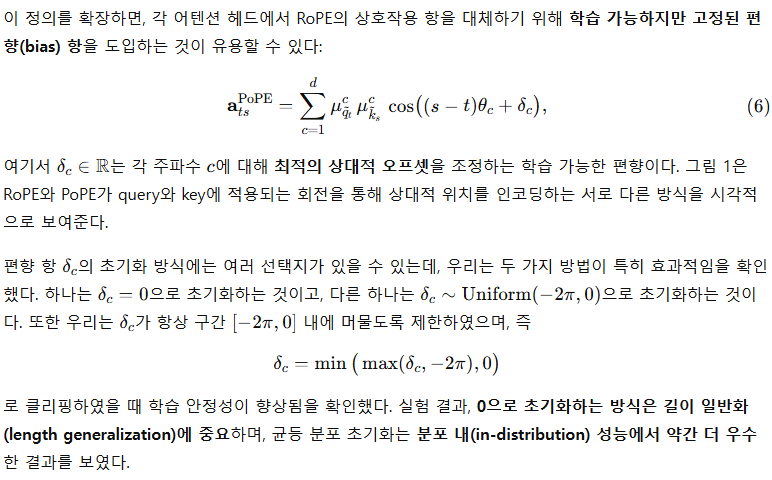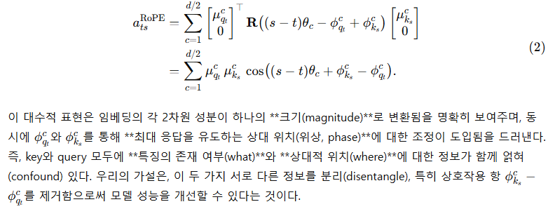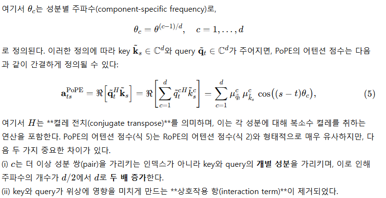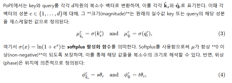 RoPE에서는 key와 query의 d/2개 성분을 복소수(complex numbers)로 해석하였다. 우리가 제안하는 방법에서는, key와 query를 표현하기 위해 극좌표 기반 표현(polar-coordinate representation)의 또 다른 형태를 사용한다. 우리는 이 방법을 PoPE(Polar Coordinate Positional Embedding)라고 부른다.