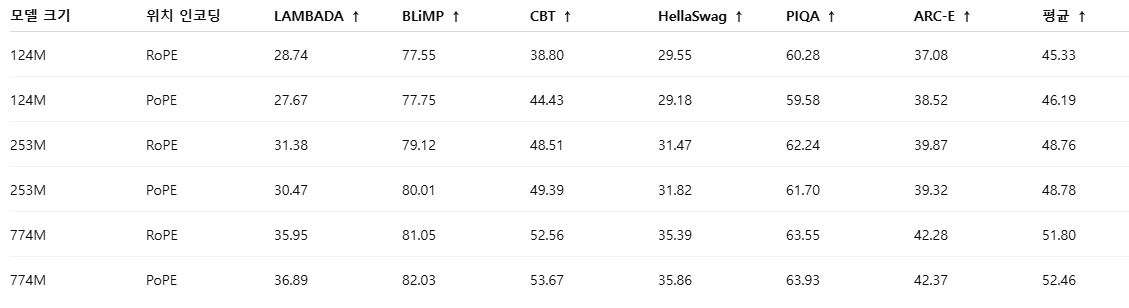 우리는 OpenWebText 데이터셋(Gokaslan & Cohen, 2019)에서 세 가지 크기의 Transformer 모델을 학습시켜, 언어 모델링에서의 PoPE의 효용성을 평가한다. 각 모델 크기에서 두 모델은 아키텍처와 학습 파라미터가 완전히 동일하며, 위치 인코딩 방식만 다르다. 모든 모델 규모에 걸쳐 PoPE는 RoPE 대비 일관되게 더 낮은 퍼플렉시티(perplexity)를 달성한다(표 4). 특히, 모델 크기가 커질수록 RoPE와 PoPE 간의 성능 격차가 유지되거나 오히려 확대되는 경향을 보인다는 점은 주목할 만하다.