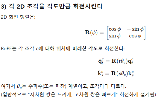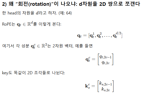 이며, θ는 기본 파장(base wavelength)이라 불린다. Query(또는 key) 성분의 구성과 2차원 회전 과정은 그림 1의 왼쪽에 도식화되어 있다.