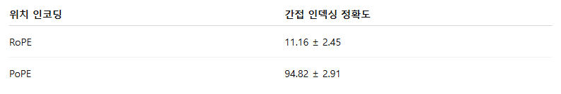 우리는 RoPE(Su et al., 2024)와 PoPE를 비교하기 위해, 동일한 Transformer 모델 두 개를 학습시키되, 마지막(목표) 토큰에 대해서만 교차 엔트로피 손실(cross-entropy loss)을 적용하고, 최종 토큰의 정확도(accuracy)로 성능을 평가한다. 표 1은 테스트 세트에서의 최종 토큰 정확도에 대한 평균과 표준편차(3개 시드)를 보여준다.