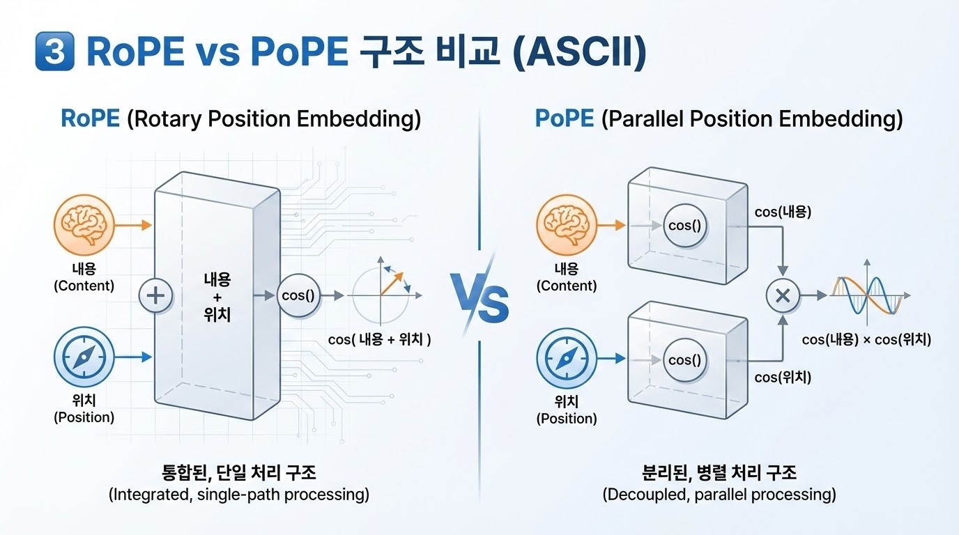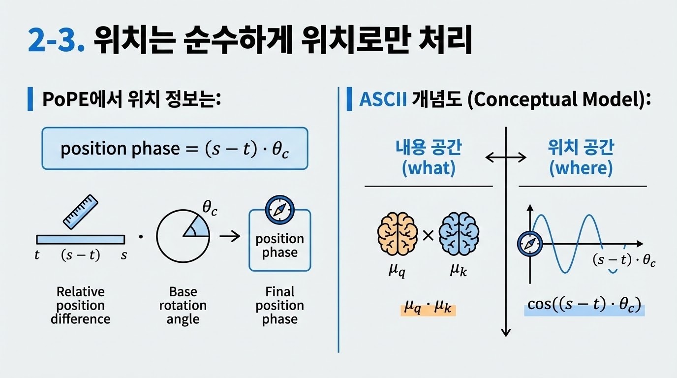 우리는 이 문제를 해결하기 위해 극좌표 위치 임베딩(Polar Coordinate Position Embedding, PoPE)이라 명명한 RoPE의 개선안을 제안하며, 이를 통해 what–where 간의 혼동(confound)을 제거한다. PoPE는 오직 위치 또는 내용만으로 인덱싱해야 하는 진단 과제에서 기존 방법 대비 월등한 성능을 보인다.