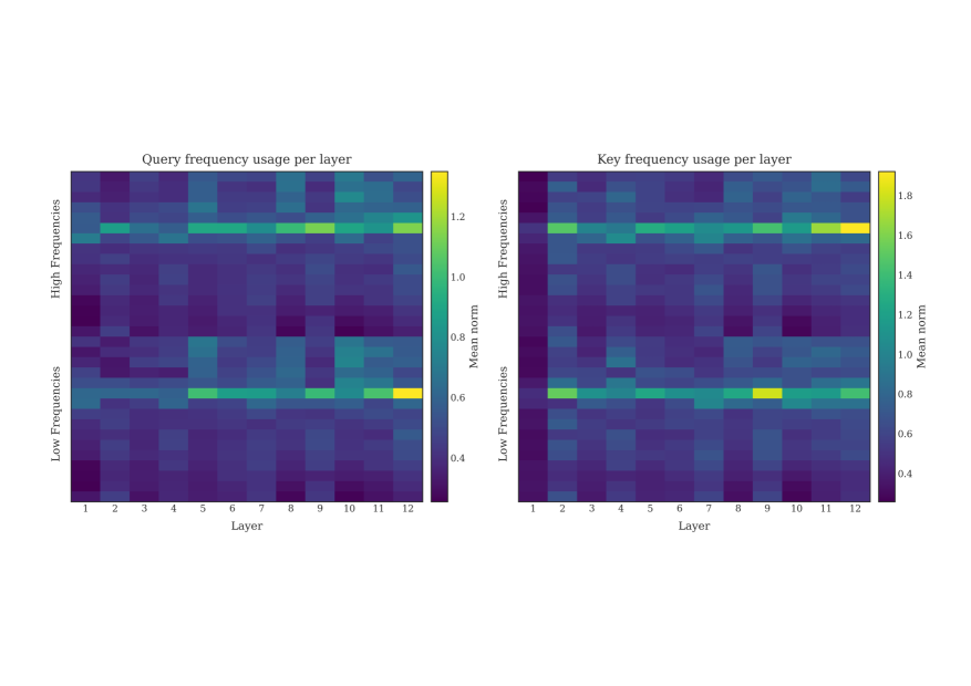 Barbero et al. (2025)은 모든 레이어에 대해 2차원 RoPE 성분의 평균 노름(norm)을 시각화함으로써, RoPE가 서로 다른 주기 길이(period length)를 갖는 특징들을 어떻게 사용하는지를 분석하였다. 이들은 Gemma 7B 모델이 간섭(interference)을 최소화하기 위해 고주파 채널(high-frequency channels)에서 낮은 노름을 유지하려는 경향이 있음을 관찰했다. 이는 해당 채널들이 어텐션 내적(attention dot product)에 기여하는 방식이 무작위 노이즈(random noise)와 유사하게 동작하기 때문이다. 반면, Gemma는 희소한 일부 저주파(low-frequency) 특징들에 대해서만 높은 노름 값을 유지한다.