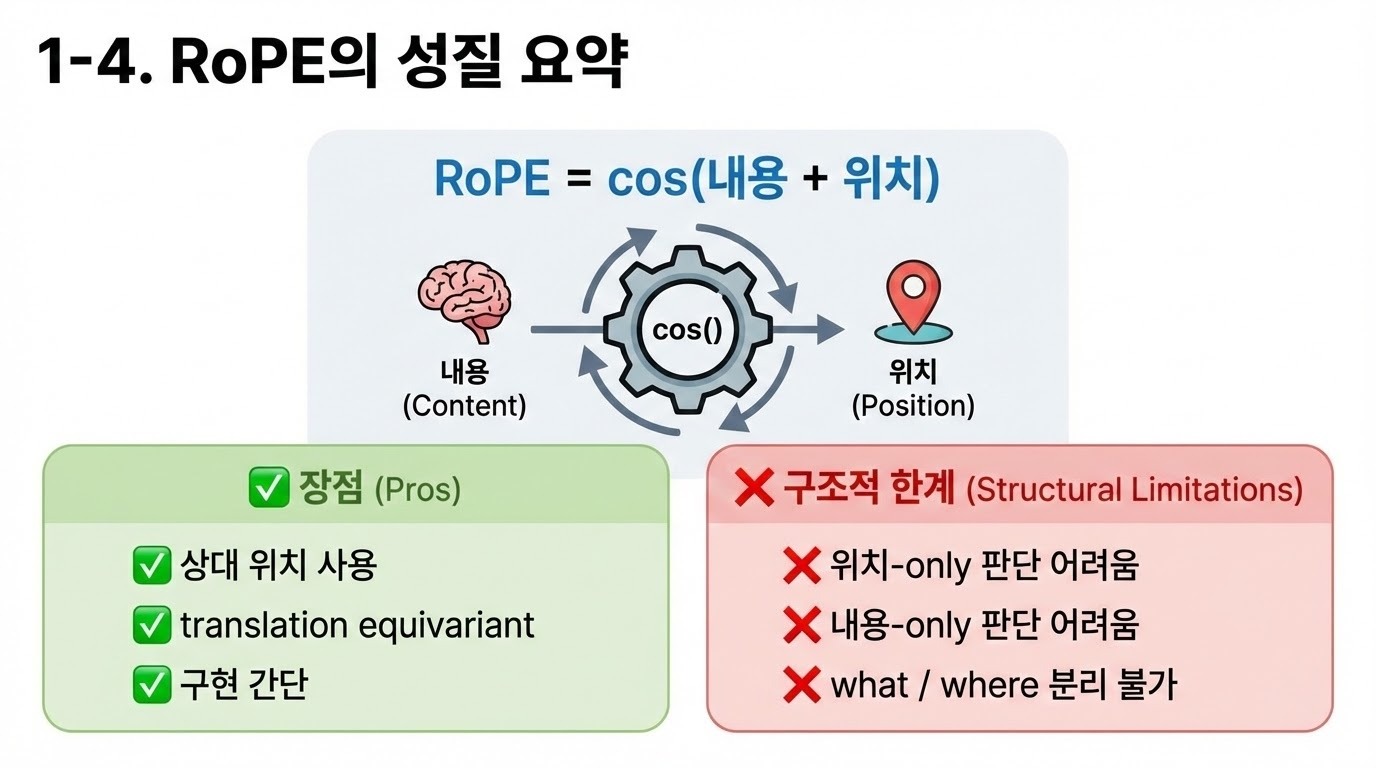 Transformer 아키텍처에서의 어텐션 메커니즘은 시퀀스 내에서의 내용(the what)과 위치(the where)라는 두 요소를 모두 기반으로 key와 query를 매칭한다. 본 논문에서는 널리 사용되는 회전 위치 임베딩(Rotary Position Embedding, RoPE)에서 이 두 요소가 서로 얽혀(entangled) 있음을 보이는 분석을 제시한다. 이러한 얽힘은 특히 내용과 위치에 대해 독립적인 매칭이 요구되는 결정 문제에서 성능 저하를 초래할 수 있다.