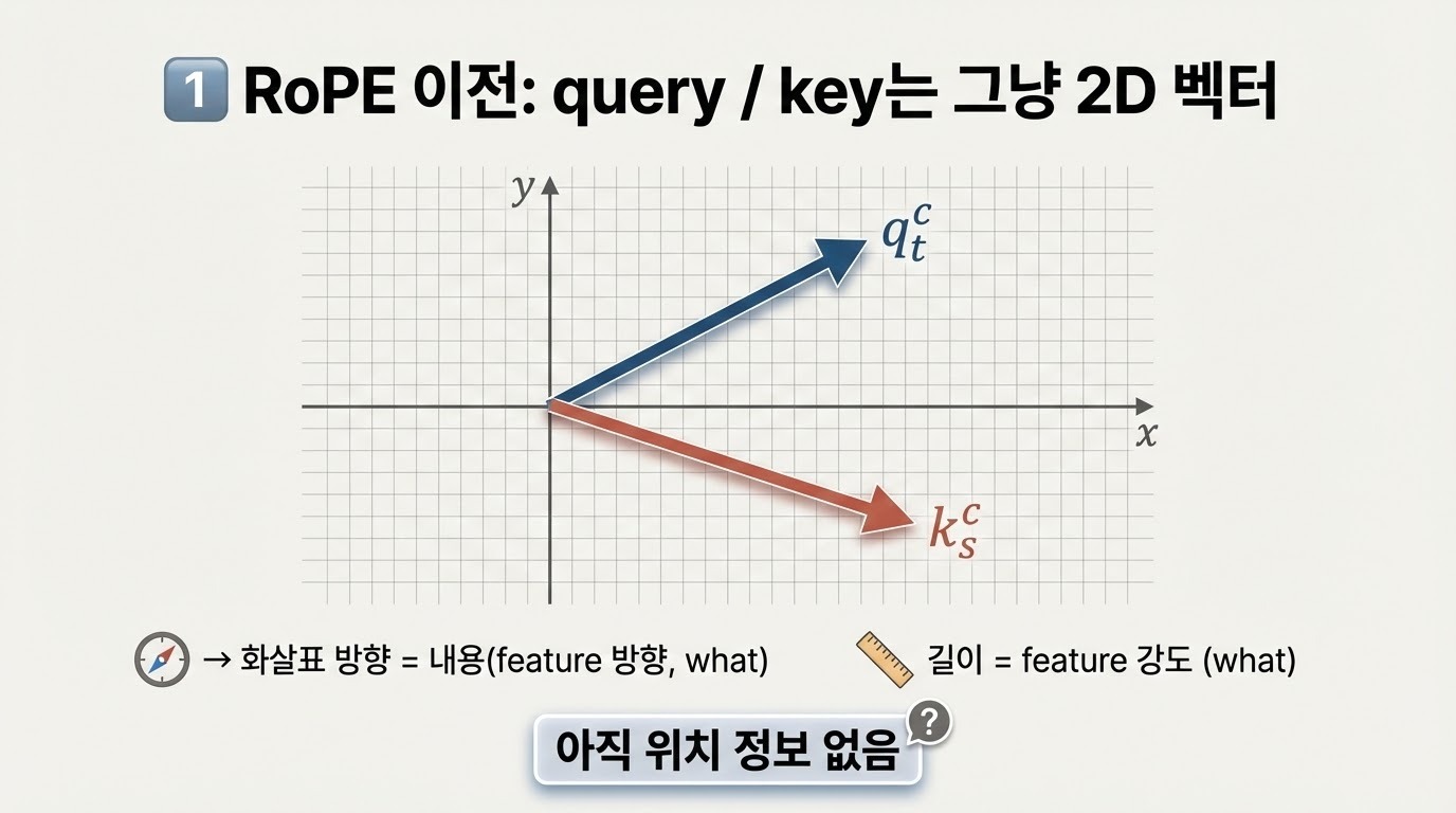 RoPE(Su et al., 2024)는 Llama 3(Grattafiori et al., 2024), DeepSeekv3(Liu et al., 2024), Gemma 3(Team et al., 2025), Qwen3(Yang et al., 2025) 등을 포함한 다수의 최신 언어 모델에서 위치 정보를 통합하는 지배적인 접근법이다. RoPE는 각 query–key 쌍에 대해, 두 벡터가 얼마나 잘 매칭되는지뿐만 아니라 입력 시퀀스 내에서의 상대적 위치를 함께 반영한 어텐션 점수를 생성한다.