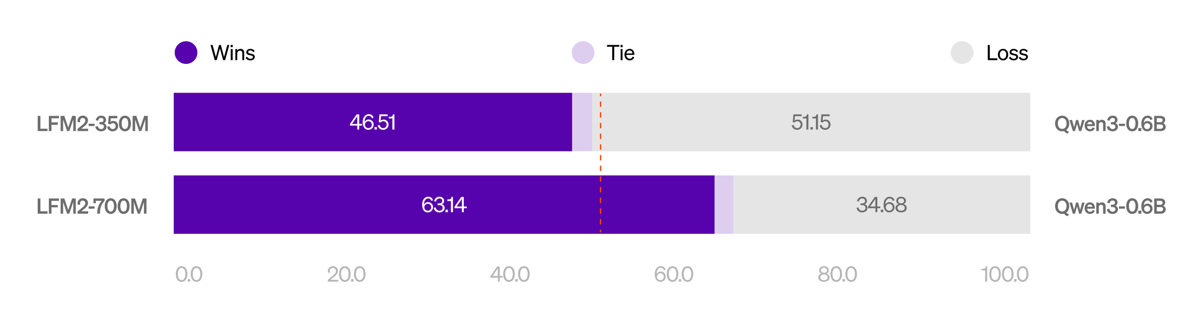 한편 LFM2-700M의 응답은 Qwen3-0.6B보다 유의미하게 더 선호되었다. 가장 작은 모델인 LFM2-350M 역시 크기가 더 작음에도 불구하고 Qwen3-0.6B와 비교해 거의 균형에 가까운 선호도 점수를 기록하며 경쟁력 있는 성능을 보였다.