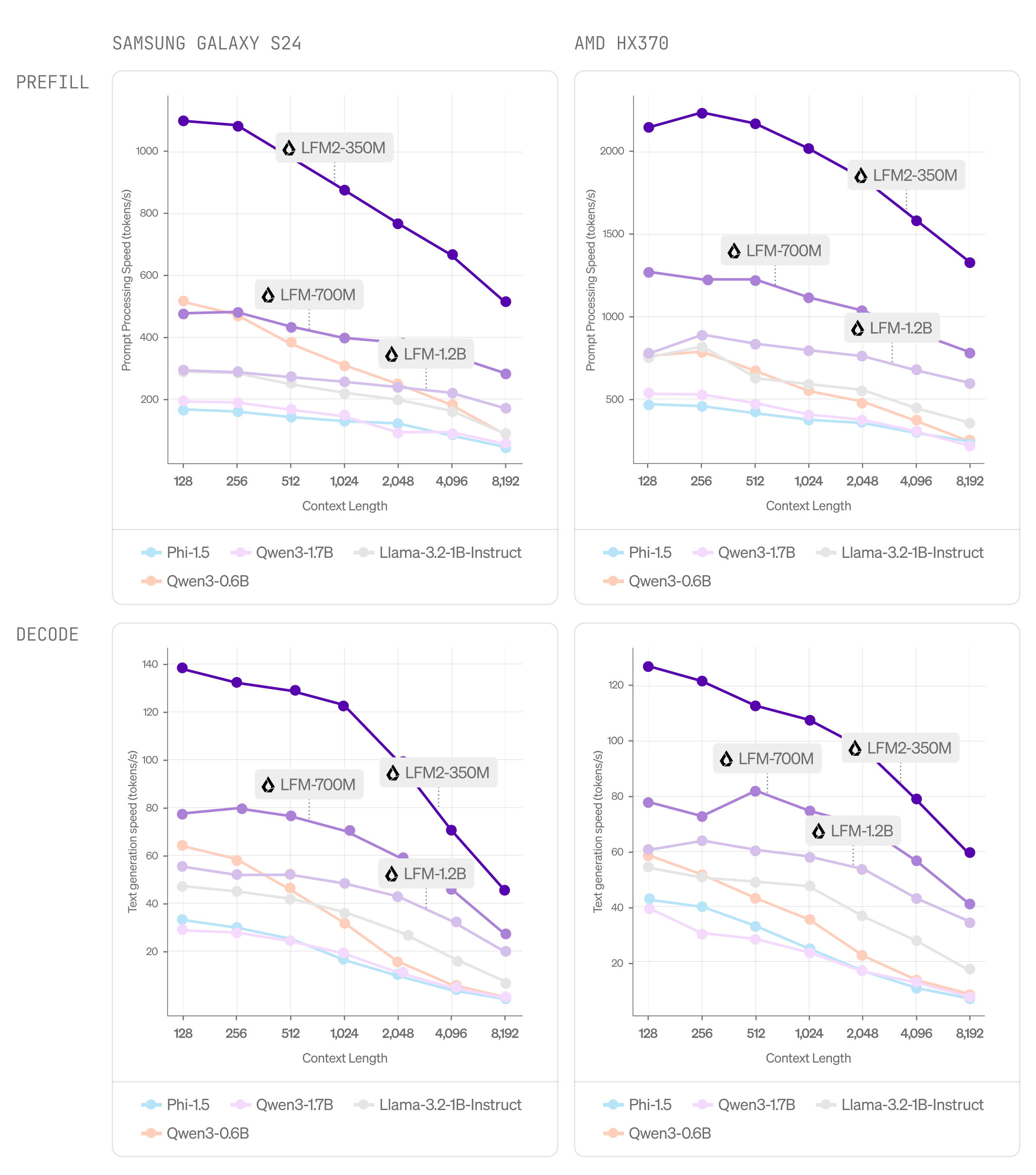 LFM2는 이전 세대 대비 학습 속도가 3배 빠르다. 또한 CPU 환경에서 Qwen3와 비교했을 때 디코딩(decode) 및 프리필(prefill) 속도가 최대 2배 향상되었다.
