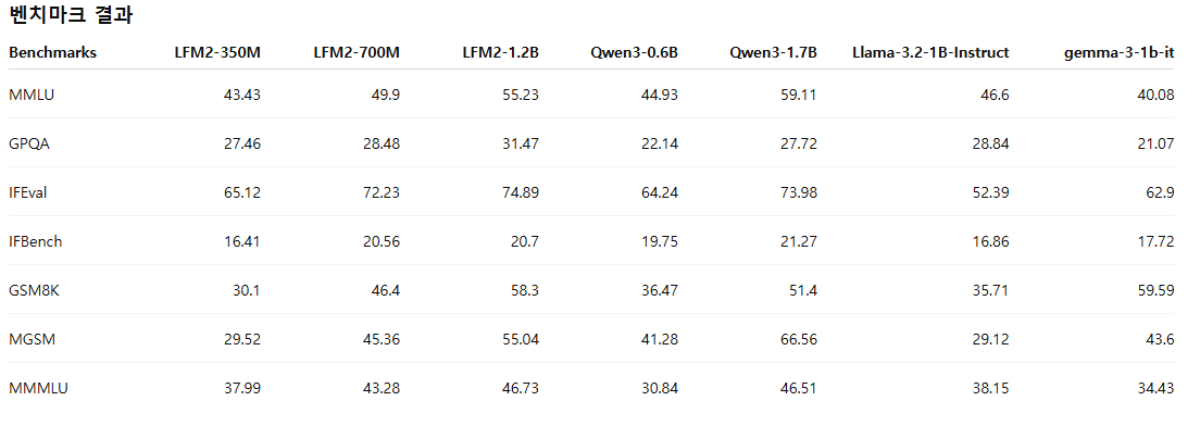 LFM2는 지식, 수학, 지시 수행(instruction following), 다국어 처리 등 여러 벤치마크 범주에서 동일 규모의 모델들을 전반적으로 능가하는 성능을 보인다.