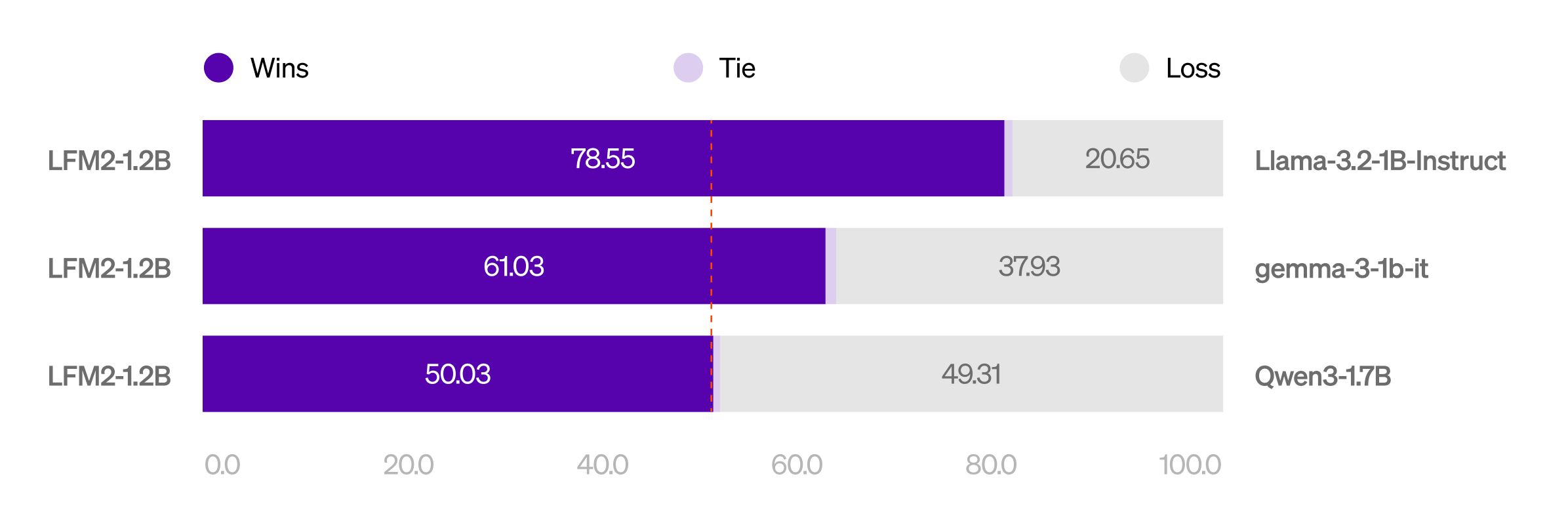 그 결과, LFM2-1.2B는 Llama 3.2 1B Instruct와 Gemma 3 1B IT 대비 유의미하게 높은 선호도를 보였다. 또한 모델 크기가 훨씬 작고 실행 속도가 더 빠름에도 불구하고, Qwen3-1.7B와 동등한 수준의 성능을 나타냈다.