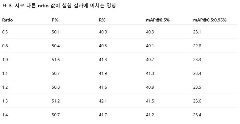 inner-MPDIoU 손실 함수에서 ratio 값의 변화가 실험 결과에 미치는 영향을 분석하기 위해, 서로 다른 ratio 값을 적용한 소거 실험을 추가로 수행하였으며, 그 결과는 표 3에 제시되어 있다.