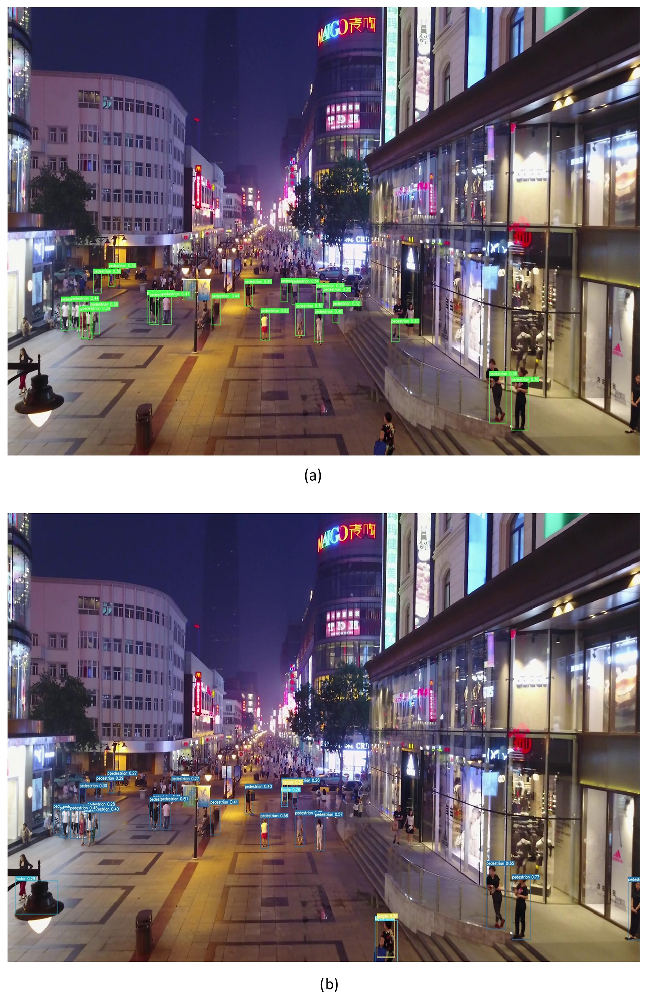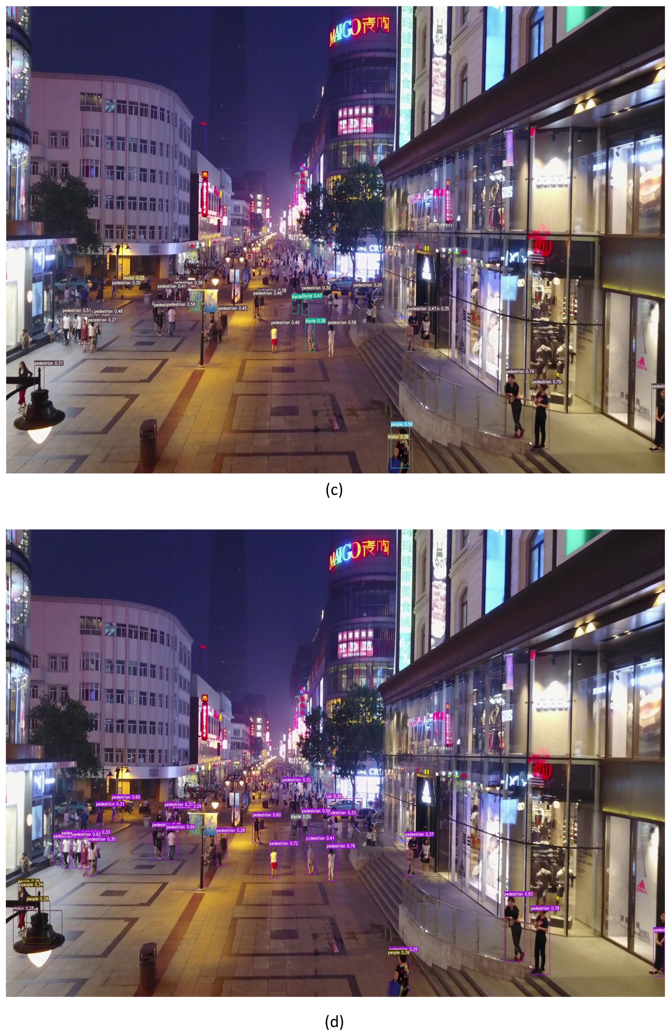 그림 7은 야간 환경에서의 탐지 성능을 보여준다. 실험 결과, 제안한 모델은 조도가 낮은 환경에서도 더 많은 보행자를 효과적으로 탐지할 수 있었으며, 이는 저조도 환경에 대한 적응 능력이 우수함을 의미한다. 이러한 결과는 개선된 알고리즘이 조명 변화에 대해 상대적으로 낮은 민감도를 가지며, 그로 인해 더 강한 항간섭 능력과 높은 네트워크 강건성(robustness)을 갖는다는 점을 시사한다.