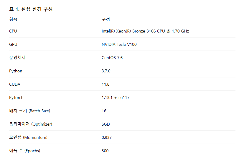 표 1은 학습 과정에서 사용된 실험 환경 구성과 주요 하이퍼파라미터 설정을 나타낸다.