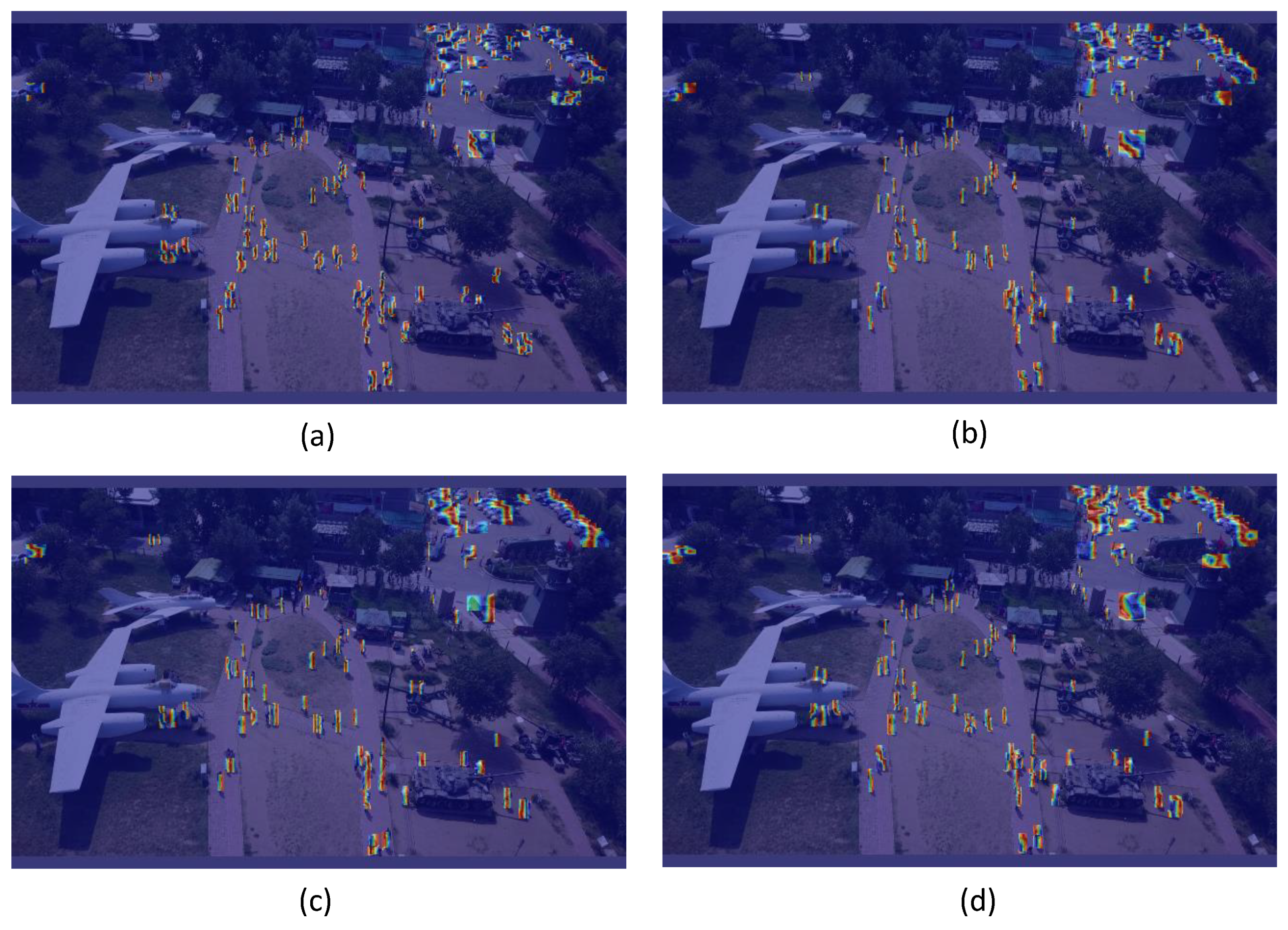 그림 8. (a–d)는 각각 밀집 장면에서 YOLOv5s, MSA-YOLO, YOLOv7-tiny, 개선된 YOLOv7-tiny 알고리즘의 탐지 결과를 나타낸다.