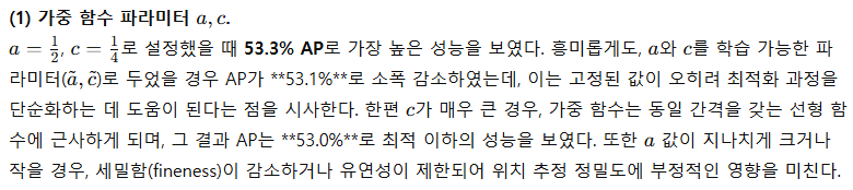 여기서 a와 c는 함수의 상한과 곡률(curvature)을 제어하는 하이퍼파라미터이다. 그림 2에서 보이듯이, W(n)의 형태는 바운딩 박스 예측이 이미 정확한 경우 작은 곡률을 통해 미세한 조정을 가능하게 한다. 반대로, 예측이 실제 값과 크게 어긋난 경우에는, 경계 근처에서의 큰 곡률과 W(n) 경계에서의 급격한 변화가 충분한 유연성을 제공하여 큰 보정이 가능하도록 한다.