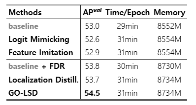 GO-LSD는 최소한의 추가 학습 비용으로 가장 높은 AP_val을 달성한다.
