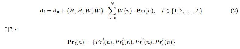 l번째 디코더 계층에서 정제된 경계 거리 𝐝_l = {t_l, b_l, l_l, r_l}는 다음과 같이 계산된다.