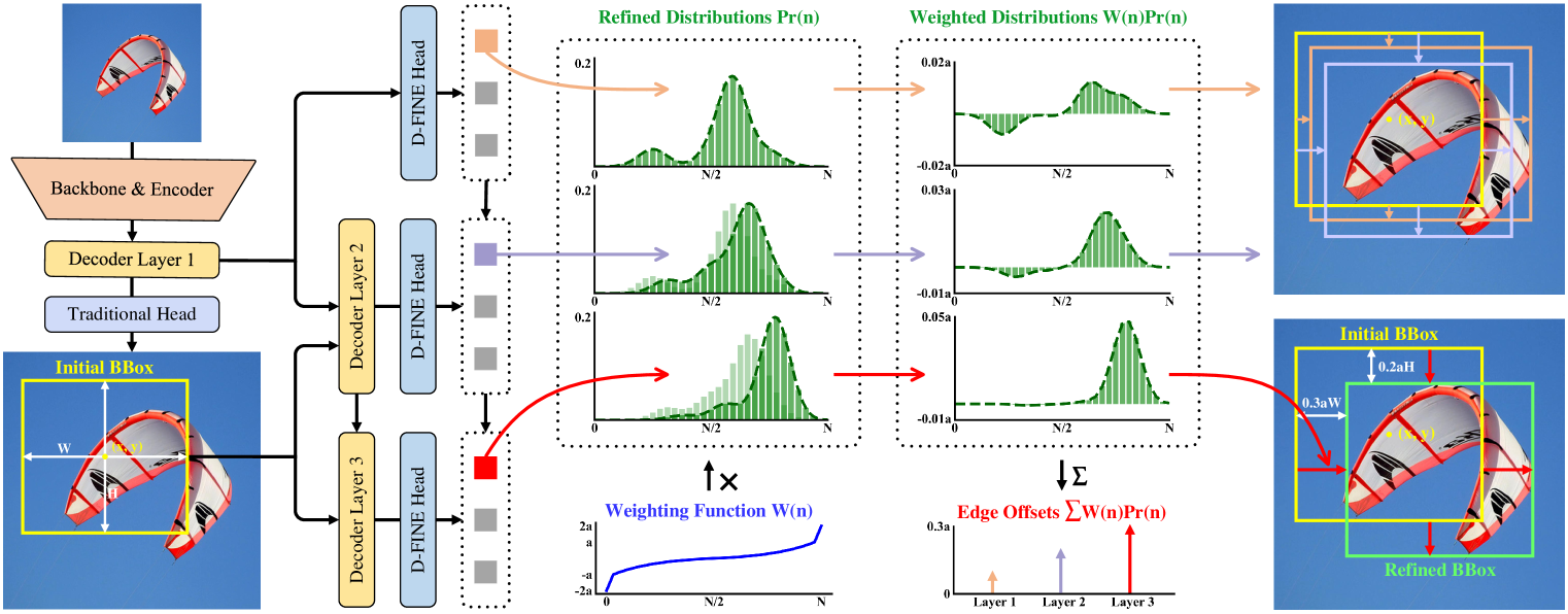 는 네 개의 독립적인 분포로 구성되며, 각각 하나의 경계에 대응한다. 각 분포는 해당 경계에 대해 가능한 오프셋(offset) 후보 값들이 선택될 확률을 예측한다. 이러한 후보 값들은 가중 함수 W(n)에 의해 결정되며, n은 전체 N개의 이산 bin 중 하나를 나타내고, 각 bin은 특정한 경계 오프셋 후보에 대응한다. 분포의 가중합(weighted sum)을 통해 경계 오프셋이 계산되며, 이후 초기 바운딩 박스의 높이 H와 너비 W로 스케일링된다. 이를 통해 조정 값이 박스 크기에 비례하도록 보장한다.