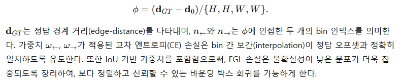 분포 예측의 정확도를 더욱 향상시키고 이를 정답(ground truth)과 정렬하기 위해, Distribution Focal Loss(DFL)(Li et al., 2020)에서 영감을 받아 세밀한 위치 추정 손실(Fine-Grained Localization, FGL Loss)을 새롭게 제안한다. FGL 손실은 다음과 같이 계산된다.