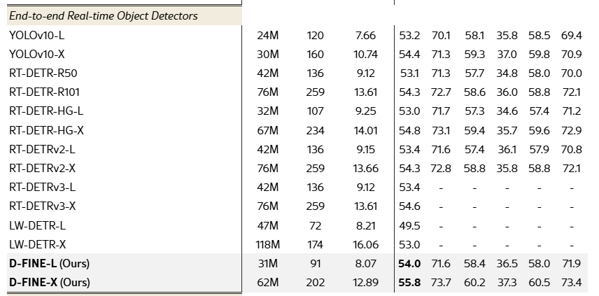 또한 D-FINE은 연산 비용이 큰 모듈과 연산에 대해 경량화 최적화를 적용하여, 속도와 정확도 사이의 균형을 더욱 개선한다. 구체적으로, D-FINE-L / X는 NVIDIA T4 GPU에서 124 / 78 FPS의 속도로 COCO 데이터셋 기준 54.0% / 55.8% AP를 달성한다. Objects365 데이터셋으로 사전학습(pretraining)한 경우, D-FINE-L / X는 각각 57.1% / 59.3% AP를 기록하며, 기존의 모든 실시간 객체 검출기를 능가한다.