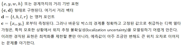 객체 검출에서의 바운딩 박스 회귀(bounding box regression)는 전통적으로 디랙 델타 분포(Dirac delta distribution)를 모델링하는 방식에 의존해 왔으며, 이는 중심점 기반 표현