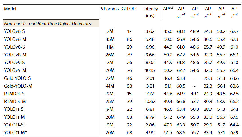 최근에는 RT-DETR(Zhao et al., 2024)과 LW-DETR(Chen et al., 2024)이 DETR을 실시간 환경에 성공적으로 적용하였다. 동시에 YOLOv10(Wang et al., 2024a) 역시 NMS를 제거하여, YOLO 계열 내에서 엔드투엔드 객체 검출로의 중요한 전환점을 제시하고 있다.